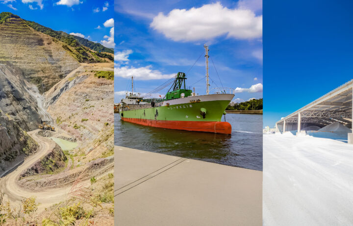 厳選した原材料トウザキは、100年先の安心のため、生コンクリートの原材料に一切の妥協をせず、厳選した原材料を日本全国から集めています。西日本からは船で輸送し、千葉県市川市のヤードに大量保管し安定供給を叶えています。東日本は鉱山の近くである栃木県佐野市に拠点を構え、自社トレーラーで厳選素材を安定供給しています。トウザキのJIS普通コンクリート